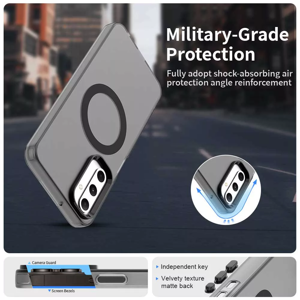 A hátlap MagSafe-kompatibilis kialakítása lehetővé teszi, hogy megfelelő mágneses kiegészítőkkel használd a tokot. A mágneses rögzítés segíthet abban, hogy a telefon stabilabban illeszkedjen az ilyen típusú tartókra vagy töltőkre, miközben a tok a készüléken marad.