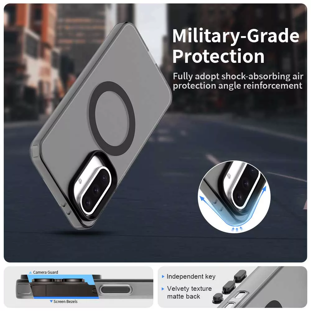 A hátlap MagSafe-kompatibilis kialakítása lehetővé teszi, hogy megfelelő mágneses kiegészítőkkel használd a tokot. A mágneses rögzítés segíthet abban, hogy a telefon stabilabban illeszkedjen az ilyen típusú tartókra vagy töltőkre, miközben a tok a készüléken marad.