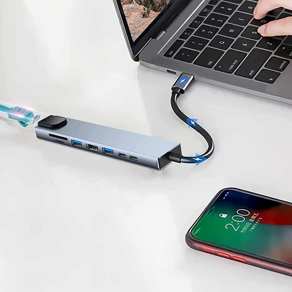 Techsuit - Docking Station NetBridge 8 in 1 (H2) - Type-C to 2x Type-C, 2x USB, HDMI, RJ45, TF/SD, 4K@30Hz, PD87W - Gray