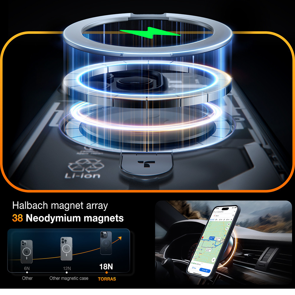 A Torras Ostand MagSafe Series tok MagSafe-kompatibilis, így a beépített mágneses gyűrű segíti a MagSafe töltők és kiegészítők pontos illeszkedését. Ez lehetővé teszi a kényelmes vezeték nélküli töltést és a kompatibilis tartók, pénztárcák vagy autós kiegészítők magabiztos rögzítését.