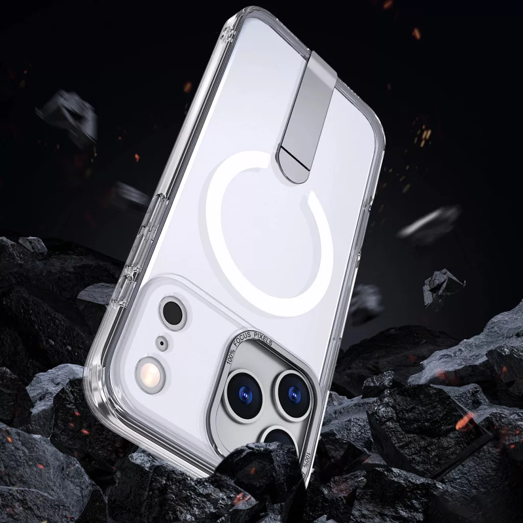 • Integrált kitámasztó: Lehetővé teszi a telefon kényelmes álló vagy fekvő helyzetbe állítását – ideális filmnézéshez vagy videóhívásokhoz.