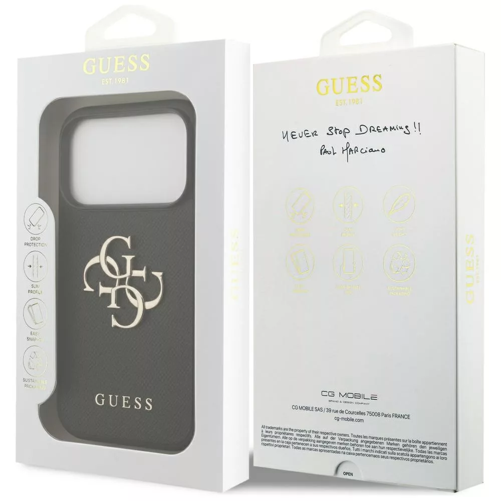 Emeld ki stílusod a Guess - Hardcase 4G Grained Big and Classic Logo MagSafe tokkal iPhone 17 Pro készülékedhez! Prémium eco-bőr és szilikon kombinációja, beépített MagSafe gyűrűvel és ikonikus Guess logóval a hátlapon.